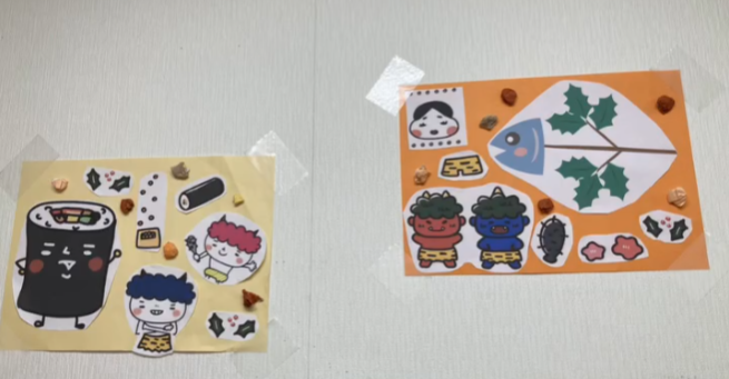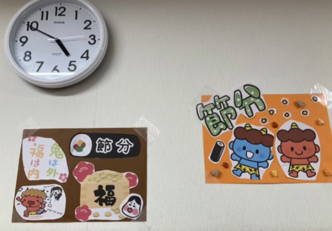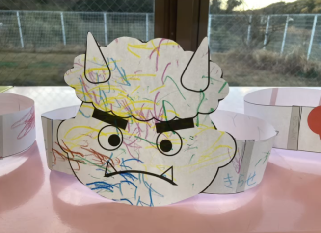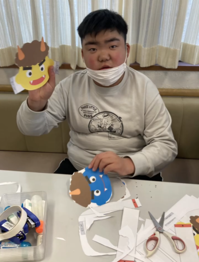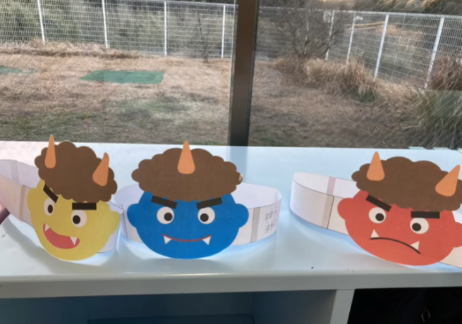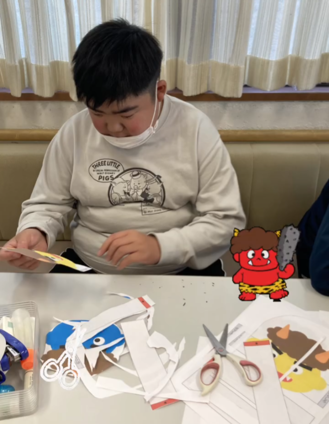 少し早いですが節分とバレンタインの装飾と鬼のお面を作りました。 ハサミの使い方も線に沿ってキレイに切る方や面白い形に切る方、皆さんの性格が出ていました☺ 装飾は、折り紙を千切って丸めて立体的な豆も作って貼ってみました😊