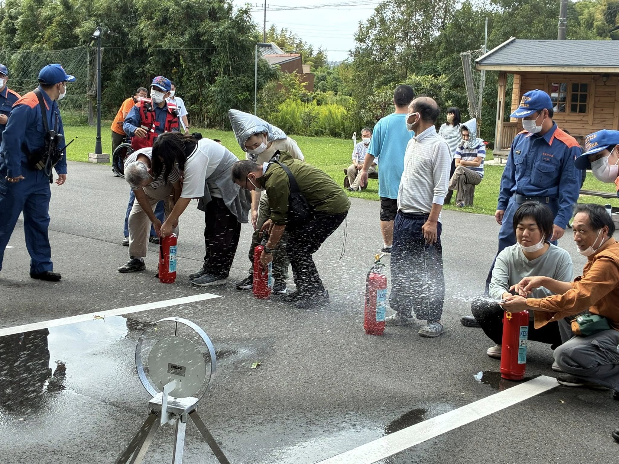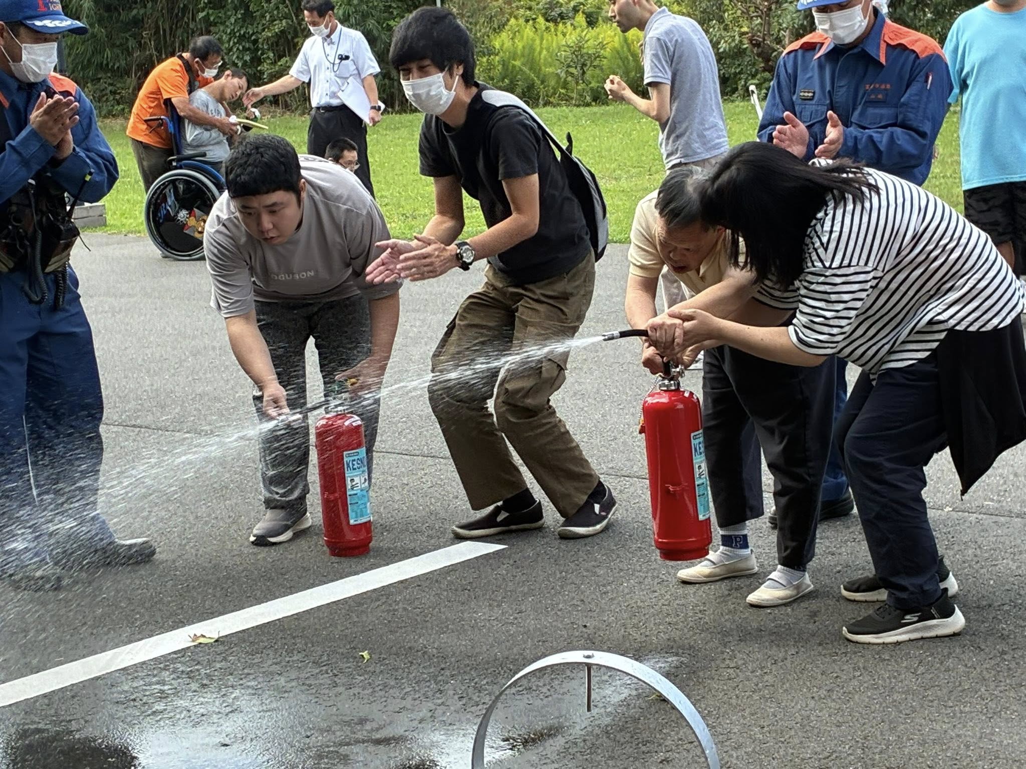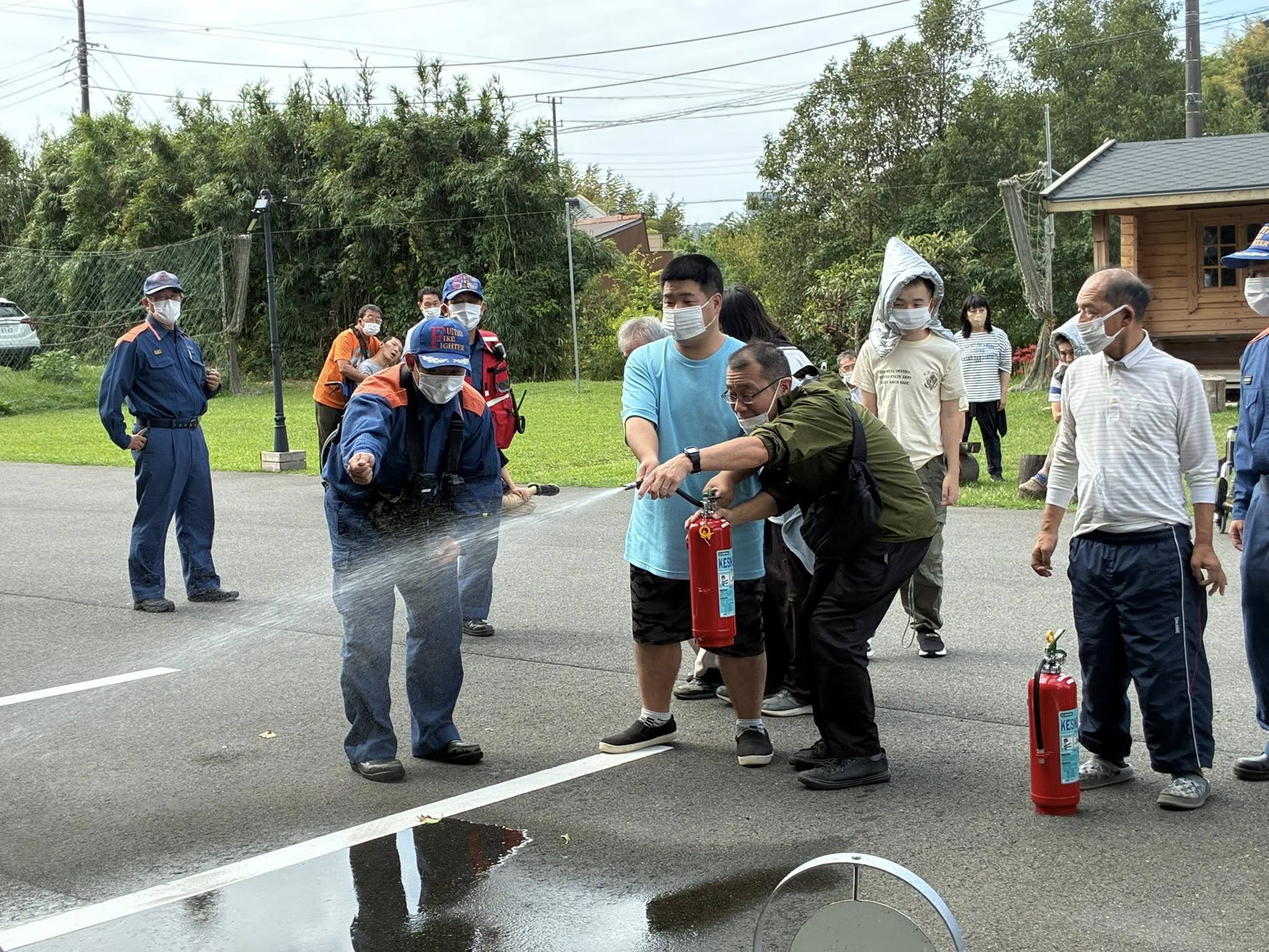 皆さんで初期消火の訓練も行なっています。